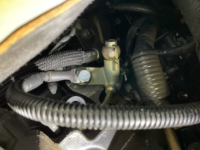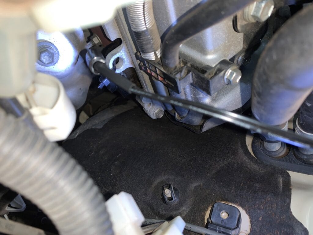 From the cabin gently draw the sensor wire through the grommet. If you have the 2 sensor model repeat the process for the second sensor wire. Run the sensor wire(s) along the hood release cable right up to the release lever. Its important to use 4 or 5 cable ties here to avoid fouling the brake or throttle. From the release lever the wire travels along the lower plastic panel to the centre audio unit.