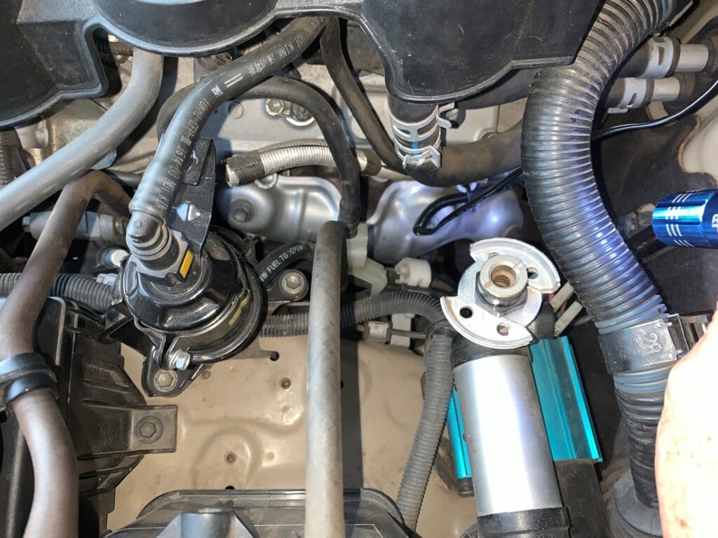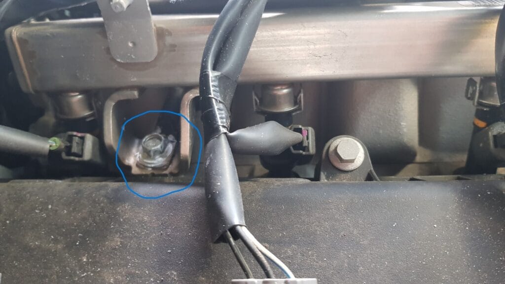 The stainless fuel rail is connected to the cylinder head with 2 x10mm bolts. The rear one has easier access. Remove the bolt, (evenly coat the sensor eye, the underside of the bolt head and the fuel rail mount with heatsink compound, if you have it, if not don't bother), make a gentle curve in the corrugated cover of the sensor and slide it under the fuel rail and onto the mount. Replace the bolt and tighten in stages to 20-26 N/m Mazda spec. Cable tie the sensors corrugated sleeve to the wiring loom on the fuel rail.