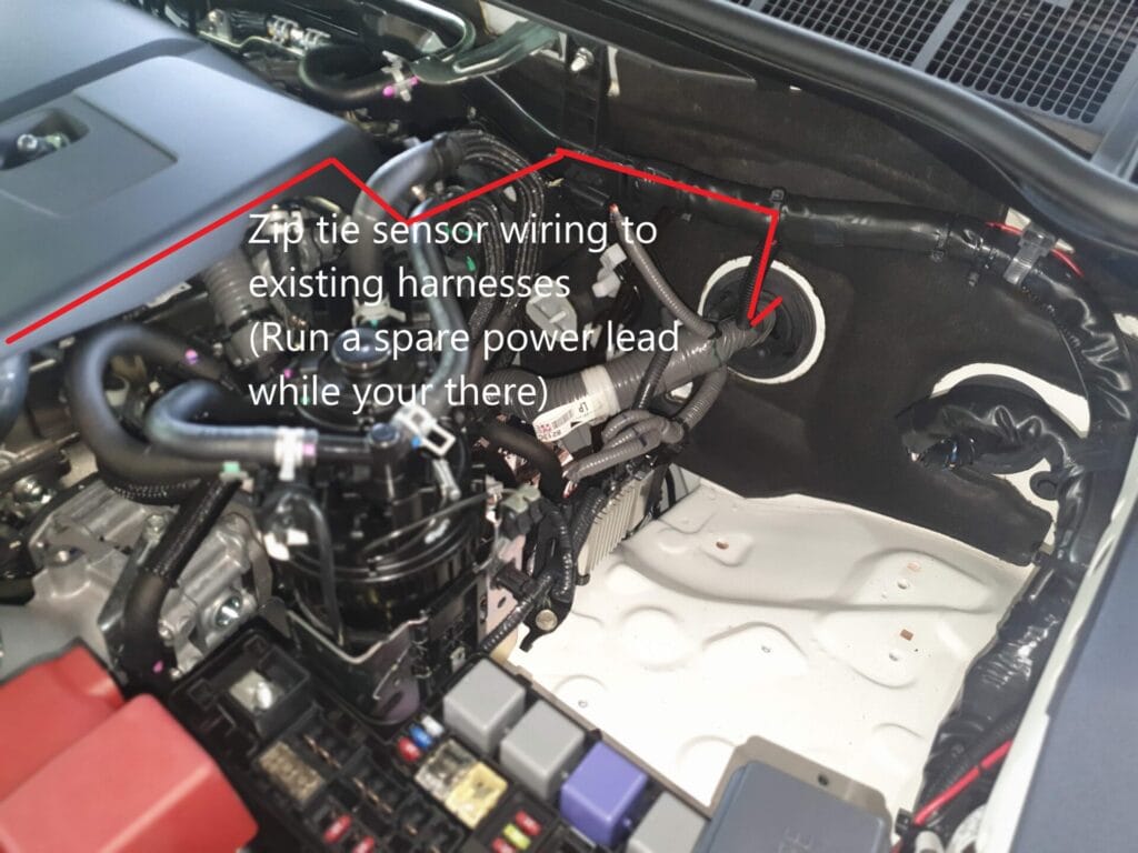 The electrical connection into the cabin is moulded and sealed and should be avoided. Run the sensor wire onto the A/C hard tube above the back of the engine. Pop the tube out of its mount, there is a gap at the back of the mount for the wire, push the tube back into the mount, cable tie down to the ABS unit to meet the hood release cable.