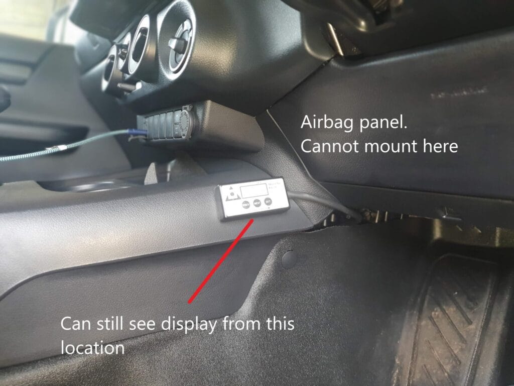 Drill a hole in the RHS of the 12V/ Aux panel, fit a grommet and run the display cable through the hole. (A black panel plug will cover the hole should you ever wish to remove it). I opted to shorten and tin all the cables and used the smallest connector block available to make all the connections including the beeper. I lengthened the beeper wire and fixed it on the underside of the dash using a velcro dot.